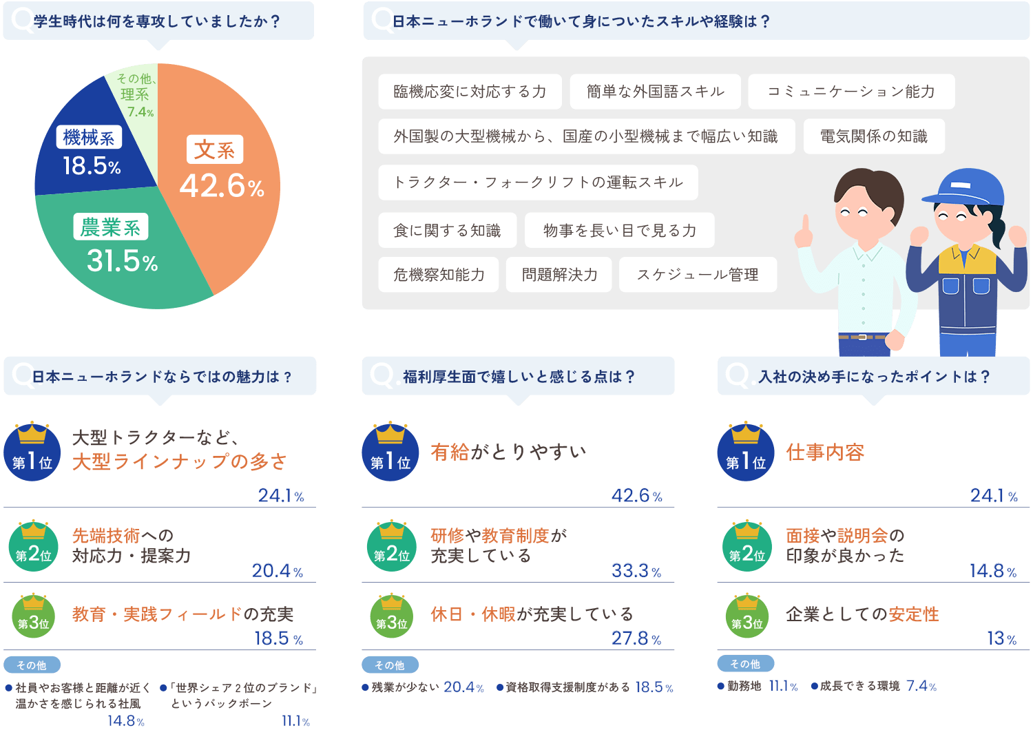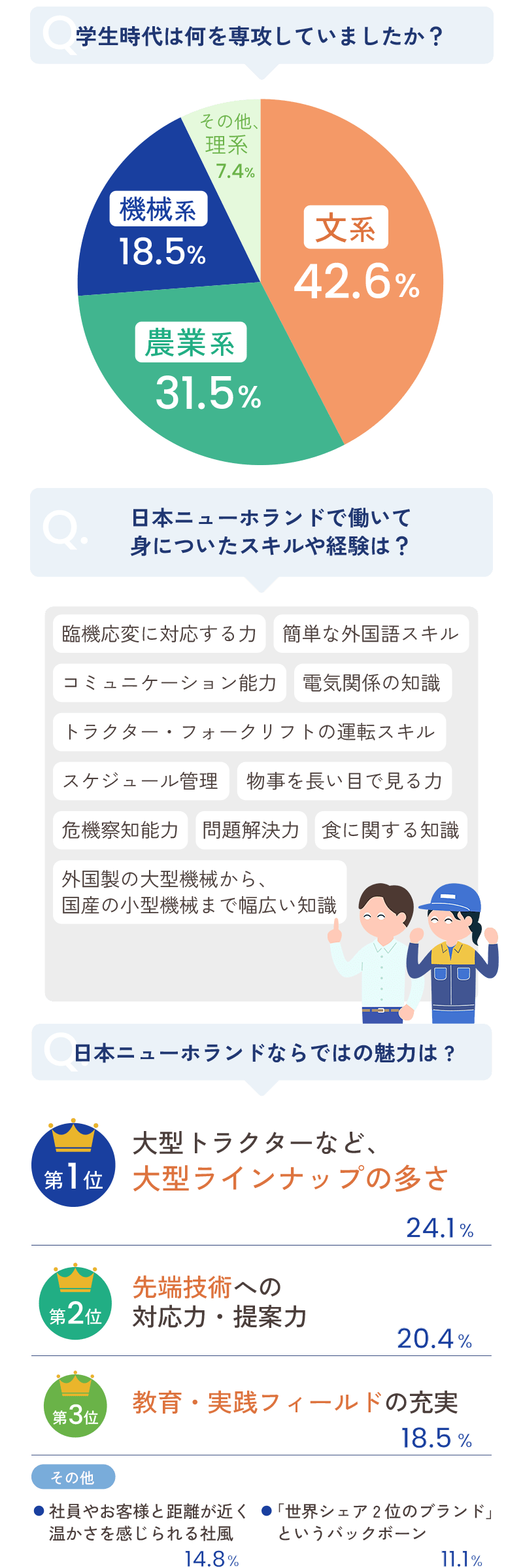 意外かもしれませんが、学生時代は文系だったという新入社員も多く、日本の農業を支えるという大きな使命感や「仕事内容」に魅力を感じ、入社を決意した方が多いようです。また、企業の安定性や入社後の成長が期待できる教育体制なども、日本ニューホランドが現役社員に支持されるポイントの一つです。
